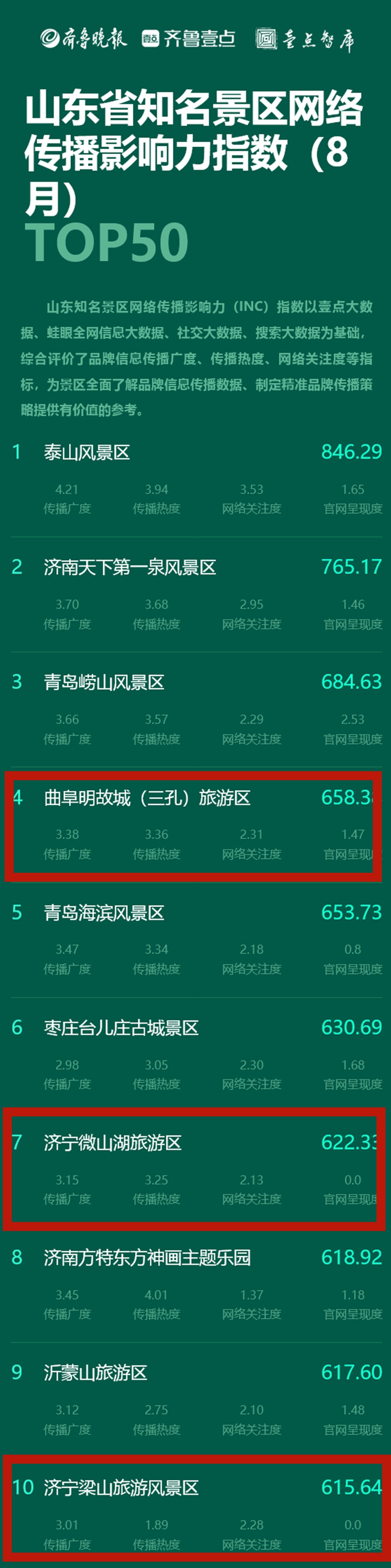 近日,由齊魯晚報、齊魯壹點、壹點智庫發(fā)起的山東省知名景區(qū)網(wǎng)絡(luò)傳播影響力指數(shù)發(fā)布,我市8月份有三家景區(qū)進入榜單前十名,數(shù)量全省第一,均為孔子文旅集團旗下景區(qū),分別是曲阜明故城(三孔)旅游區(qū)、微山湖旅游區(qū)和水泊梁山風景區(qū)。