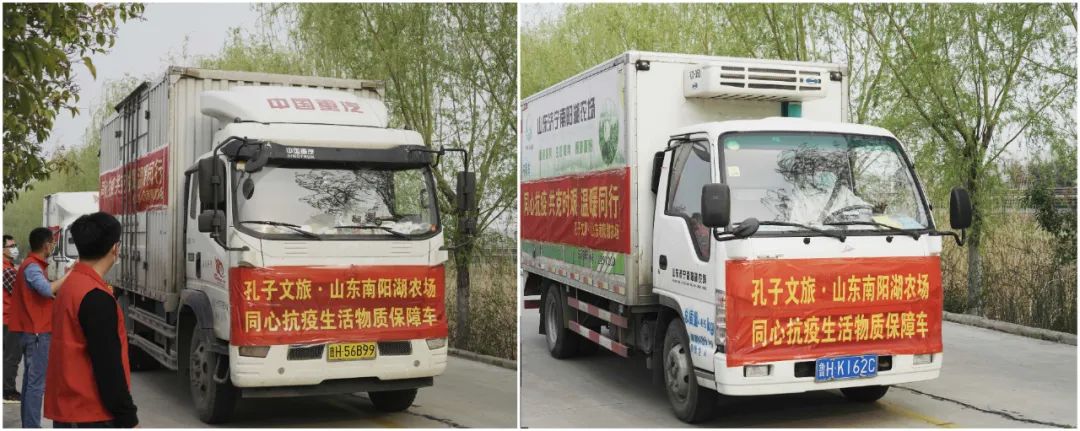 2022年4月6日下午,來自濟寧孔子文旅集團·南陽湖農(nóng)場的3輛運輸抗疫物資的貨車隊,滿載著3000箱物資,包含南陽湖農(nóng)場種植、生產(chǎn)的30噸綠色有機蔬菜、肉類、蛋類等,已安全順利抵達曲阜。