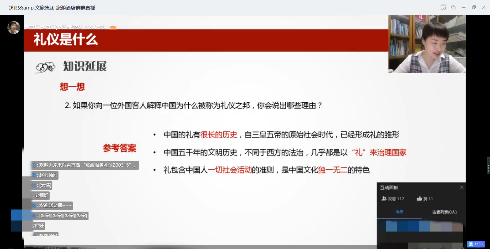 集團(tuán)充分發(fā)揮在研學(xué)游與文旅職業(yè)培訓(xùn)板塊的行業(yè)優(yōu)勢(shì),積極聯(lián)系學(xué)院優(yōu)秀講師和區(qū)域內(nèi)、乃至全國(guó)知名的專家學(xué)者,這些老師在專業(yè)水平和理論研究方面都有很深的造詣,課件圖文并茂,聲像并舉,講解深入淺出,引人入勝,老師們?cè)谑谡n過程中結(jié)合自身工作實(shí)際和對(duì)行業(yè)發(fā)展的認(rèn)識(shí),理論聯(lián)系實(shí)際,為學(xué)生充分解讀課程內(nèi)容。并在授課過程中設(shè)置習(xí)題和互動(dòng),在保證線上教學(xué)質(zhì)量的同時(shí)增強(qiáng)了學(xué)生的參與感,確保線上教學(xué)的教學(xué)進(jìn)度和質(zhì)量。