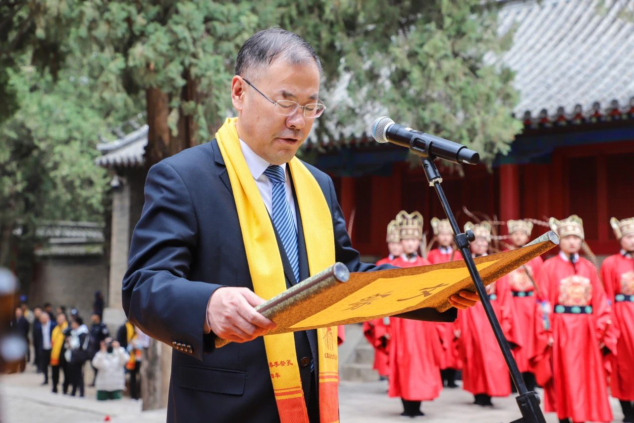 曲阜市委副書記、曲阜市人民政府市長崔加清恭讀祭文。所有參禮嘉賓集體向至圣先師行三鞠躬禮。甲辰年曲阜尼山春季祭孔大典圓滿禮成。