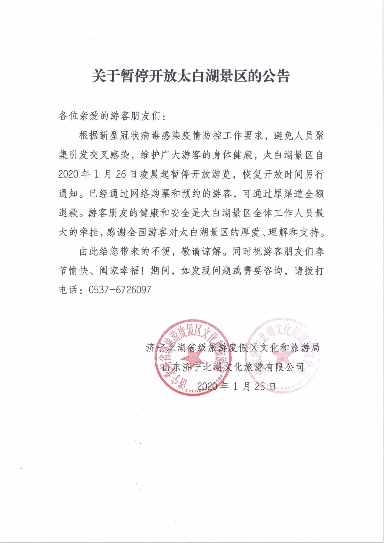 關(guān)于暫停開放太白湖景區(qū)的公告