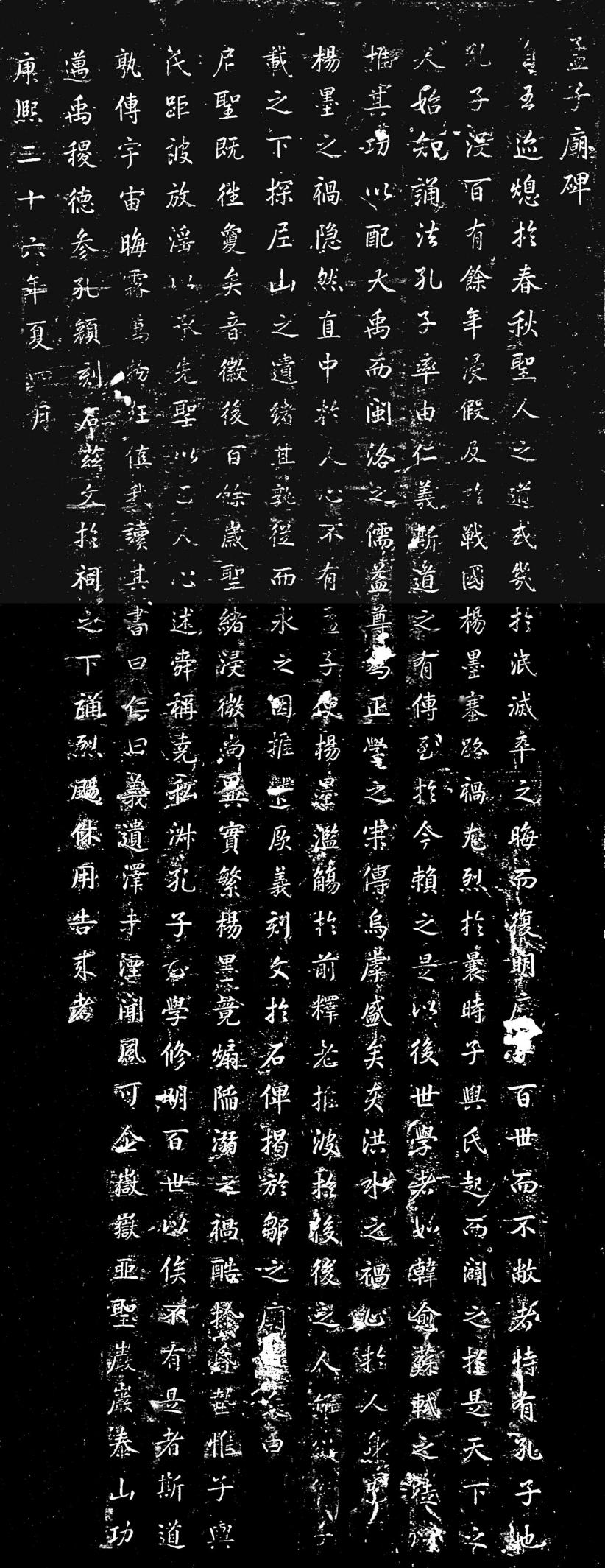 自王跡熄于春秋,圣人之道或幾于泯滅,卒之晦而復(fù)明,歷千百世而不敝者,恃有孔子也??鬃記]百有余年,浸假及于戰(zhàn)國,楊墨塞路,禍尤烈于曩(nǎng)時(shí),子輿氏起而辟之,于是天下之人始知誦法孔子,率由仁義,斯道之有傳至于今賴之。是以后世學(xué)者如韓愈、蘇軾之徒咸推其功以配大禹,而閩洛之儒益尊為正學(xué)之宗傳。烏乎!盛矣!夫洪水之禍,止于人身已爾;楊墨之禍,隱然直中于人心。不有孟子,使楊墨濫觴于前,釋老推波于后,后之人雖欲從千載之下探尼山之遺緒,其孰從而求之?因推述厥義,刻文于石,俾(bǐ)揭于鄒之廟。其文曰: