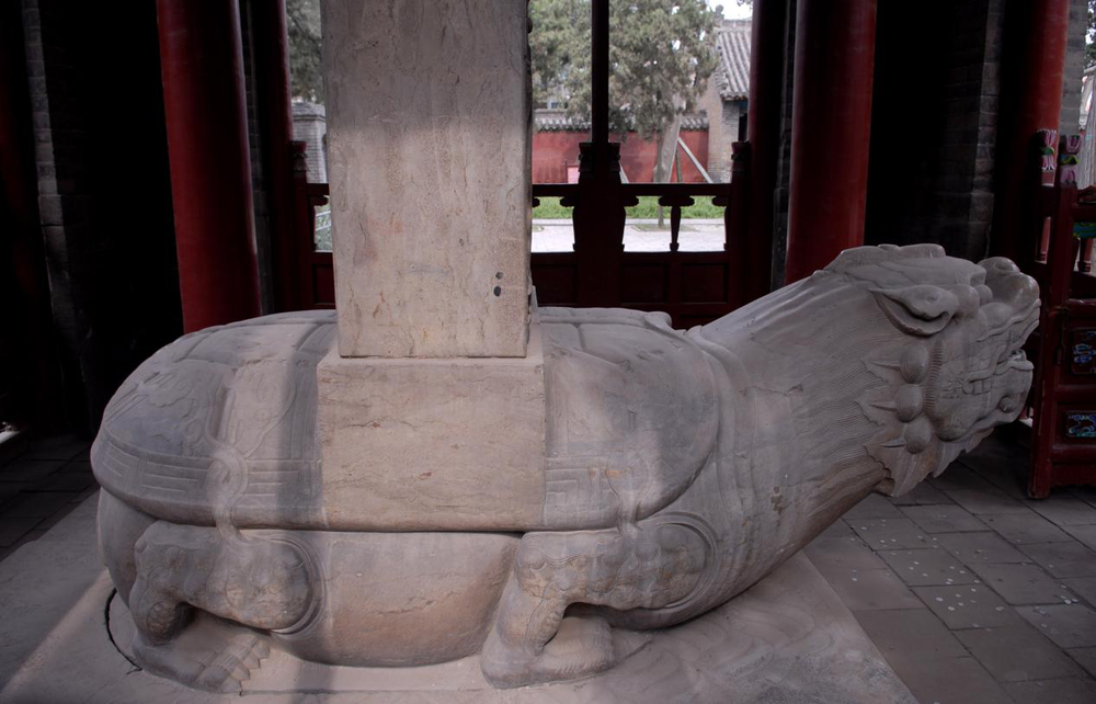 碑身下為一巨大赑屃。相傳赑屃為龍的九子之一,是我國古代的一種祥獸,性溫和,善負(fù)重,外型似龜。古人為給死后的帝王圣賢樹碑立傳,歌功頌德,常用巨大的石碑立于赑屃背上,意在依靠其神力,可以千秋永存。御制孟子廟碑身下的這只赑屃,獅首、龜蓋、鷹爪、蛇尾,昂首平背,氣勢(shì)磅礴。它的頭離地1.30米,身高1.00米,寬1.54米,長(zhǎng)3.50米。石質(zhì)光潤如玉,刻工精湛細(xì)膩,造型栩栩如生。赑屃趴臥于一塊長(zhǎng)3.20米,寬2.55米的長(zhǎng)方形石座上。石座平面陰線深雕水紋,赑屃若浮于滄海碧波之中。充分體現(xiàn)了我國古代工匠高超技藝,具有較高的藝術(shù)價(jià)值。