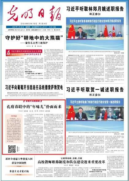 1月28日,光明日?qǐng)?bào)開設(shè)《全球共寫新春聯(lián)》專欄,頭版報(bào)道《孔府春聯(lián)中的“年味兒”撲面而來》,關(guān)注孔府春聯(lián)里的深厚文化和時(shí)代精神。以下為報(bào)道全文: