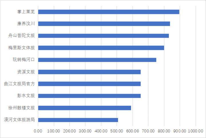 2020年1月,縣級(jí)文化和旅游主管部門(mén)開(kāi)通抖音號(hào)的有605個(gè),239個(gè)賬號(hào)有內(nèi)容更新,366個(gè)賬號(hào)無(wú)內(nèi)容更新,文化和旅游抖音傳播力指數(shù)排在前10位的分別是:掌上萊蕪、中國(guó)最美的鄉(xiāng)村—婺源、曲江文旅局官方、赤峰紅山文旅、敦煌文化旅游、濟(jì)源旅游、Come on北碚、溆浦旅游、純凈荔波、廣西鐘山旅游。其中,“掌上萊蕪”當(dāng)月視頻播放量達(dá)1700萬(wàn)次。