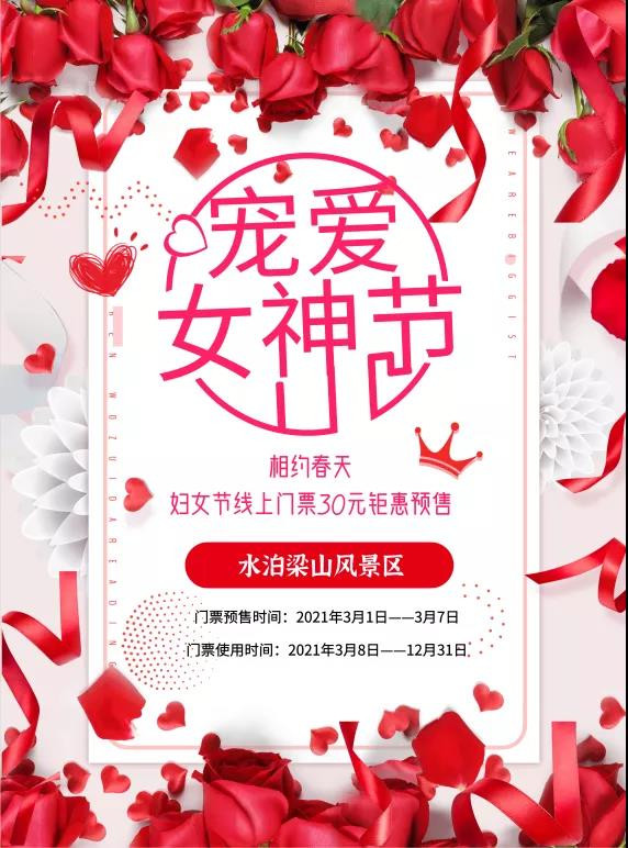 為慶祝2021年3月8日第111個(gè)國(guó)際婦女節(jié),水泊梁山風(fēng)景區(qū)推出“相約春天婦女節(jié)門票半價(jià)預(yù)售”活動(dòng)。