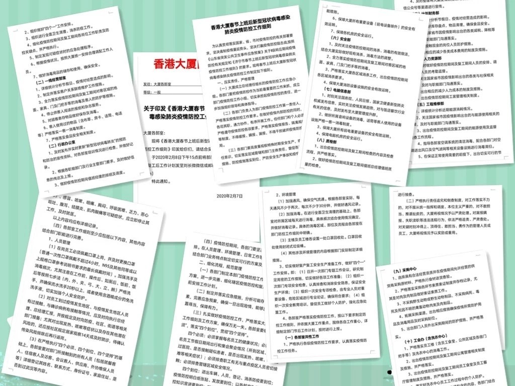 四是加強(qiáng)宣傳引導(dǎo),消除恐慌心理。通過微信群、QQ群及時(shí)轉(zhuǎn)載中央、省、市關(guān)于防控工作的決策部署和情況通報(bào)。在大堂電子顯示屏上輪播新型冠狀病毒肺炎預(yù)防和防治宣傳專題片,介紹健康防控知識,提高防控意識。另外,大廈中高層管理人員通過語音視頻等形式召開會(huì)議,加強(qiáng)工作調(diào)度,提升學(xué)習(xí)能力。