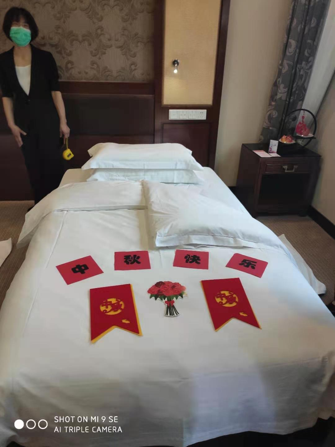 客房部 中式鋪床,甩單、包角、套被子動(dòng)作干凈利落、一步到位,夜床創(chuàng)意溫馨優(yōu)雅、主題鮮明,“中秋房、國慶房、新婚房”等主題元素唯美突出,給人留下深刻的印象。