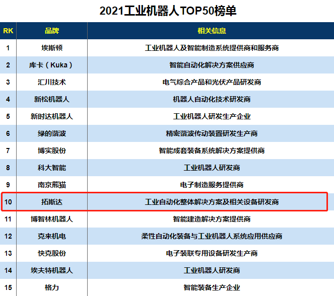 此前,拓斯達(dá)亦入選“2021工業(yè)機器人TOP 50”“2021廣東企業(yè)500強”榜單,分別位列第10名、第417名。